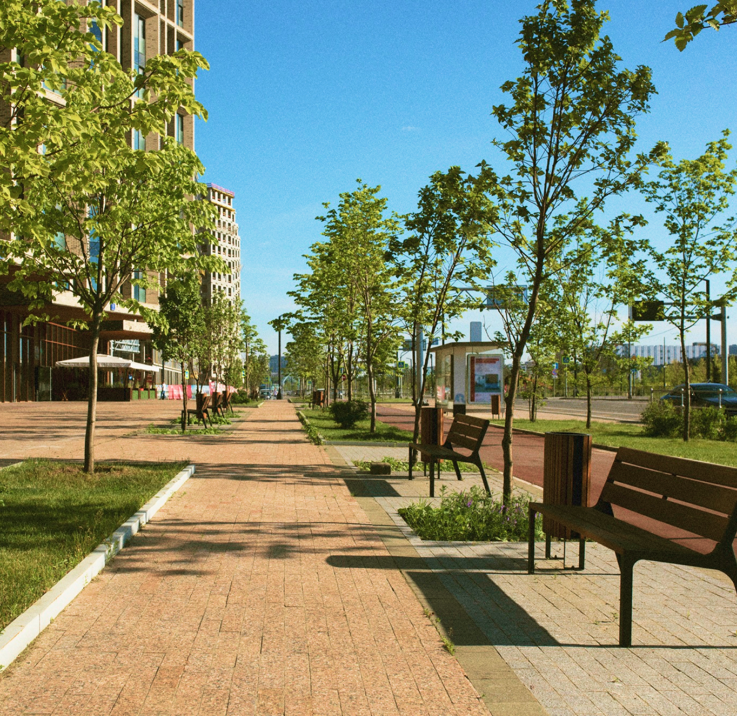 Проектом предусмотрено качественное благоустройство дворов, современные детские площадки, организация зон для занятий спортом. - двор без машин (на внутридворовое пространство разрешен доступ только специализированного автомобильного транспорта (автомобили скорой помощи, пожарные и пр.). Доступ личного а/м транспорта разрешен только для загрузки и выгрузки пассажиров и багажа) - наличие многофункциональных детских площадок, выполненных с применением натуральных материалов и безопасных покрытий. - наличие спортивной зоны (поля для футбола и баскетбола, площадки для йоги). - наличие велодорожки по периметру жилого комплекса, вписанные в единый велокаркас, а также организованные открытие и закрытые велопарковки. - комплексное озеленение и благоустройство территории выполнено по индивидуальному ландшафтному дизайн-проекту: с фасадной стороны домов максимальное озеленение цветущими кустами, во дворе лаконичное озеленение хвойными деревьями разных пород, валуны, изогнутые пешеходные дорожки, оригинальные лаконичные деревянные скамейки со спинками и зарядкой для гаджетов, установка фонарного освещения. - наличие пешеходного бульвара композиционно наполненного зелеными насаждениями.